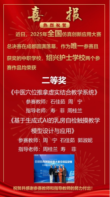 本届大赛由工业和信息化部人才交流中心主办,旨在推动数字仿真技术应用,服务国家产业发展。比赛伊始,beat365官网领导高度重视,教研室全程指导,教师团队不懈努力,时刻紧扣大赛宗旨,将仿真技术与护理学教学及临床实践难题深度融合。《中医穴位推拿虚实结合教学系统》、《基于生成式AI的乳房自检触摸教学模型设计与应用》这两项作品分别聚焦于中医护理与外科护理仿真训练等领域,通过构建高仿真的虚拟场景与交互模型,有效提升了护理技能训练的精准性与应对复杂临床情况的能力,获得了评审专家对其实用性、创新性的高度认可。